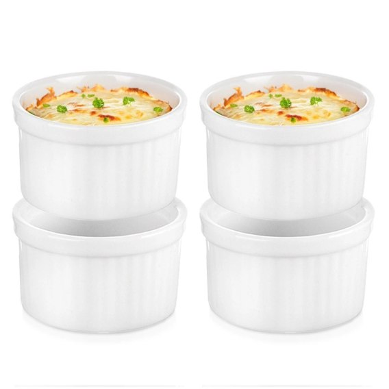 Zestaw czterech małych miseczek o uniwersalnym zastosowaniu. Wykonane z porcelany w białym kolorze. Idealne na dipy oraz przekąski. Nadają się do zmywarki i zapiekania.