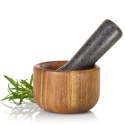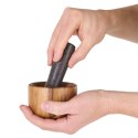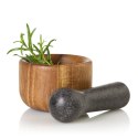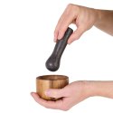 Moździerz Taru o pojemności 100ml, która rozbudzi kuchenną kreatywność. Wykonany z naturalnych materiałów ułatwi miażdżenie i ścieranie zarówno wysuszonych jak i świeżych ziół oraz przypraw, uwalniając pełnię smaków. Kształt tłuczka oraz misy są idealnie dopasowane, aby umożliwić wszechstronne użytkowanie. Miska została wykonana z antybakteryjnego drewna akacjowego, natomiast tłuczek z neutralnego smakowo granitu. Produkt został zaprojektowany przez Rolanda Kreitera. Zaleca się czyścić ręcznie! Materiał: miska drewno akacjowe, granit. Przybliżone wymiary miski: średnica - 9,3cm, wysokość - 6cm. Przybliżone wymiary tłuczka: średnica - 4cm, wysokość - 13cm. Przybliżone wymiary brutto: wysokość - 11,2cm, długość - 10cm, szerokość - 12,5cm. Przybliżona waga brutto: 0,520kg. Opakowanie: kartonowe pudełko prezentowe.