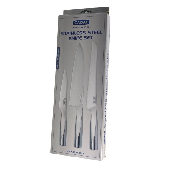 Zestaw noży ze stali nierdzewnej składa się z trzech podmiotów, mających różne zastosowanie w kuchni.Pierwszym nożem w zestawie jest nóż do obierania o długości 12 cm z gładką krawędzią. Jest to doskonałe narzędzie do precyzyjnego obierania różnych warzyw i owoców, ale może być również używane do innych drobnych aczkolwiek precyzyjnych prac. Dzięki niemu można łatwo usunąć żyłki z mięsa/ krewetek, wyjąć nasiona lub wykonać delikatne krojenia czy dekoracje.Kolejnym nożem w zestawie jest nóż szefa kuchni o długości 20 cm. Ten uniwersalny nóż jest niezastąpiony w każdej kuchni. Jego główne zastosowanie to między innymi krojenie, siekanie, krojenie w kostkę. Zakrzywione ostrze tego noża doskonale przylega do deski do krojenia, co zapewnia precyzje w każdym detalu.Trzecim nożem w zestawie jest ząbkowany nóż do chleba o długości 20 cm. Ząbkowane ostrza świetnie nadają się do krojenia chleba, bułek czy ciast. Ząbki na ostrzu ułatwiają przecinaniem chrupiącej skórki chleba, a także świetnie radzą sobie z wilgotnym wnętrzem.Cadac Set to niezastąpione narzędzia w każdej kuchni. Oferują one różne opcje cięcia i krojenia, idealne do różnych potraw i składników.Dzięki nim praca w kuchni staje się łatwiejsza, bardziej efektywna oraz znacznie przyjemniejsza.Parametry techniczne:Długość noża do obierania: 12 cmDługość noża szefa kuchni: 20 cmDługość noża do chleba: 20 cm
