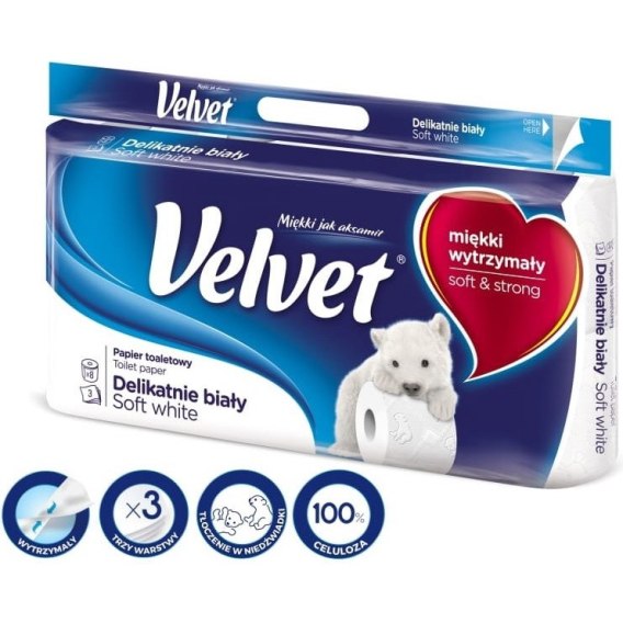 * papier toaletowy marki VELVET wyróżnia się aksamitną miękkością, eleganckimi tłoczeniami oraz niezawodną wytrzymałością listków