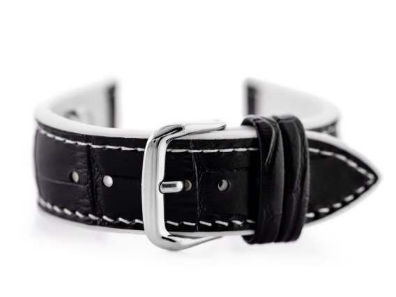 Pasek gumowy w kolorze biało-czarnym ze skórzanym wierzchem, przeszywany białą nicią.