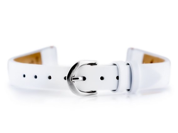 Pasek ze skóry naturalnej w kolorze białym. Klamerka ze stali szlachetnej w kolorze srebrnym.