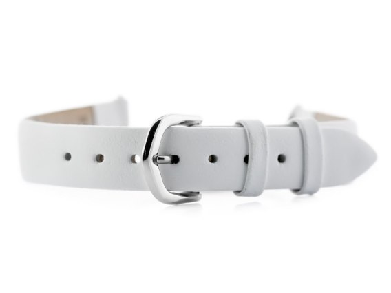 Pasek ze skóry naturalnej w kolorze białym. Klamerka ze stali szlachetnej w kolorze srebrnym.