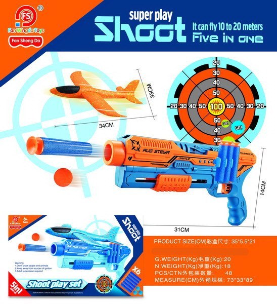 Zestaw 5w1, pistolet na strzałki, kulki z tarczą i samolocikiem dla dzieci od 6-go roku życia. Pistolet jest lekki i wygodny w trzymaniu, łatwy w użyciu. Wystarczy umieścić w magazynku miękkie, piankowe pociski z przyssawką lub piłki piankowe i nacisnąć spust a naboje poszybują daleko. Funkcje: - odpowiedni dla dzieci powyżej 6-go roku życia, - lekki, łatwy w użyciu i wygodny w trzymaniu pistolet, - 5 w 1: * pistolet na pociski, * pistolet na kulki, * pistolet jako wyrzutnia, * pistolet na pociski z tarczą, * samolocik do zabawy, - bogate wyposażenie zestawu. |
