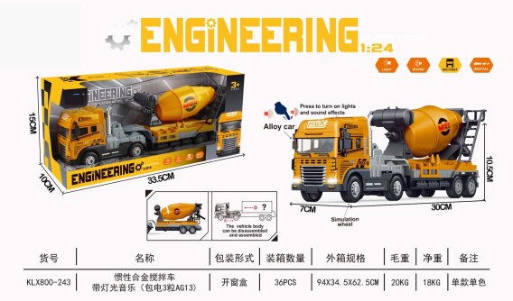 Interaktywna betoniarka dla dzieci od 3-go roku życia. Betoniarka wykonana została w skali 1:24, posiada metalową, wytrzymał kabinę i skrętną przyczepę wykonaną z najlepszej jakości plastiku. Przyczepę możemy odczepiać, grusza do betonu jest ruchoma. Pojazd posiada mrugające przednie lampy oraz funkcje dźwiękowe: odgłos jazdy pojazdu, klakson, odgłos cofania. Koła w pojeździe posiadają gumowe bieżniki i napęd na tył. Zabawka zasilana jest bateriami typu 3 x AG3 (w zestawie). Funkcje zestawu: - odpowiedni dla dzieci powyżej 3-go roku życia, - wykonany z najlepszej jakości materiałów (metal i plastik), - wykonany w skali 1:24, - gumowe koła, zapewniają dobrą przyczepność do podłoża, - napęd na tylne koła, - mrugające światła przednie wywrotki, - odgłosy jazdy pojazdu, klakson, cofania, - odczepiana przyczepa, - ruchoma gruszka do betonu. |