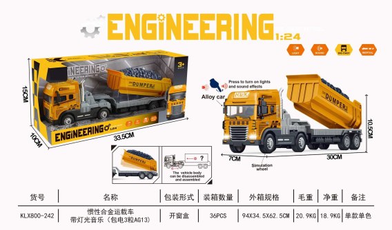 Interaktywna wywrotka dla dzieci od 3-go roku życia. Wywrotka wykonana została w skali 1:24, posiada metalową, wytrzymał kabinę i skrętną przyczepę wykonaną z najlepszej jakości plastiku. Przyczepę możemy odczepiać, manualnie podnosić, opuszczać, ruchoma jest również tylna klapa przyczepy. Pojazd posiada mrugające przednie lampy oraz funkcje dźwiękowe: odgłos jazdy pojazdu, klakson, odgłos cofania. Koła w pojeździe posiadają gumowe bieżniki i napęd na tył. Zabawka zasilana jest bateriami typu 3 x AG3 (w zestawie). Funkcje zestawu: - odpowiedni dla dzieci powyżej 3-go roku życia, - wykonany z najlepszej jakości materiałów (metal i plastik), - wykonany w skali 1:24, - gumowe koła, zapewniają dobrą przyczepność do podłoża, - napęd na tylne koła, - odczepiana przyczepa, - mrugające światła przednie wywrotki, - odgłosy jazdy pojazdu, klakson, cofania, - podnoszona i opuszczana przyczepa, - podnoszona klapa tylna przyczepy. |