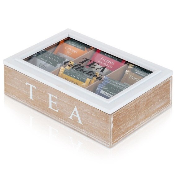 Pojemnik do przechowywania torebek herbaty. Posiada 6 przedziałek, w których możemy umieścić ulubione herbaty. Pojemnik ma wymiary 24,5 x 16 x 7 cm. Przegródki mają wymiary 7,5 x 7 x 6 cm.