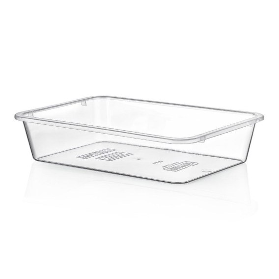 - Przezroczysty prostokątny pojemnik o wymiarach 25 x 17 x 5,5 cm i pojemności 1,7 litra