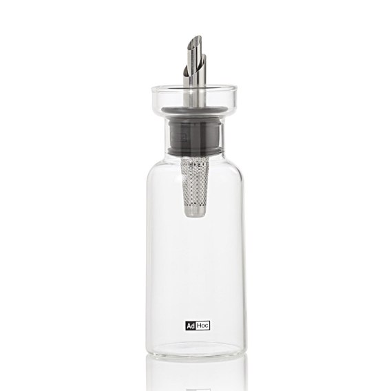 Dyspenser do oliwy lub octu AROMA POUR o pojemności 120ml ze szkła borokrzemowego z nalewakiem grawitacyjnym ze stali nierdzewnej wykończonym silikonowym kołnierzem uszczelniającym. Dozownik do oleju lub octu AROMAPOUR marki Ad Hoc jest wykonany ze szkła borokrzemowego i wyposażony w sprytny nalewak, który nie tylko zapobiega kapaniu, ale odprowadza krople z powrotem do butelki. Filtr ze stali nierdzewnej zatrzymuje zioła i przyprawy podczas nalewania. Rozwiązanie typu GravitySeal zapewnia hermetyczne zamknięcie. Dodatkowo nalewak dla lepszej higieny można osłonić kapturkiem z tworzywa. Wszystkie elementy można myć w zmywarce. Należy jednak przy tym przestrzegać zasad mycia metalu i tworzyw w zmywarce, elementy metalowe powinny być wyjęte ze zmywarki natychmiast po zakończeniu cyklu mycia i dokładnie wytarte do sucha a temperatura mycia nie powinna przekraczać 40oC w związku z kołnierzem uszczelniającym wykonanym z silikonu. Brak przestrzegania powyższych zaleceń oraz stosowanie agresywnych środków do mycia może przyczynić się do uszkodzenia tworzywa i powstania ognisk rdzy. Materiał: szkło borokrzemowe, stal nierdzewna, silikon, tworzywo. Przybliżone wymiary: - pojemność: 120ml, - wysokość: 18,5cm, - średnica dół: 5,7cm. Przybliżone wymiary brutto: - wysokość: 21.8cm, - długość: 8,9cm, - szerokość: 8,9cm. Przybliżona waga brutto: 0,253kg. Opakowanie: kartonowe pudełko prezentowe.