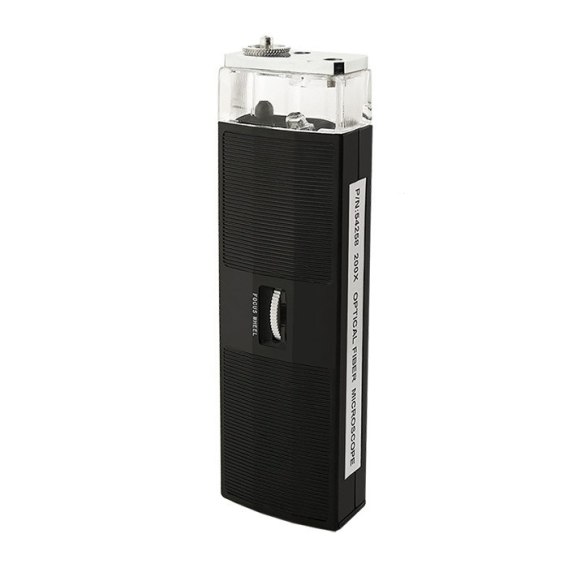 Mikroskop ręczny do złącz światłowodowych o powiększeniu (zoom) 200x służy do obserwacji złącz końcówek światłowodowych. Posiada on własne oświetlenie bateryjne oraz obudowę z wytrzymałego tworzywa.