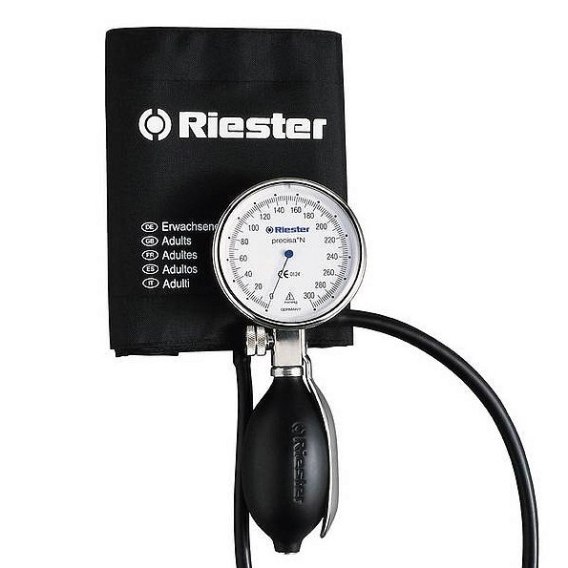 Ciśnieniomierz zegarowy Riester Precisa model N Ciśnieniomierz zegarowy. Dostępny jest w obudowie z tworzywa sztucznego. Przeznaczony do użytku profesjonalnego i domowego. Ciśnieniomierz precisa N uzyskał świadectwo klinicznej walidacji BHS.Riester Precisa N parametry techniczne: maksymalny błąd pomiarowy wynosi +/- 3 mm Hg, zawór spustowy z płynną regulacją specjalnie utwardzana berylem i miedzią membrana, bez konieczności zerowania wskazówki, całość w winylowym etui Opcje Mankietów: - mankiet zawijany dla dorosłych 24 - 32 cm RIESTER 1360-101 - mankiet na zaczepy dla dorosłych 24 - 32 cm RIESTER 1360-104 - mankiet na rzepy dla dorosłych RIESTER 24 - 32 cm 1360-107 - mankiet duży na rzepy dla dorosłych 32 - 42 cm RIESTER 1360-122 - mankiet na rzepy dla dzieci RIESTER 13 - 20 cm 1360-129