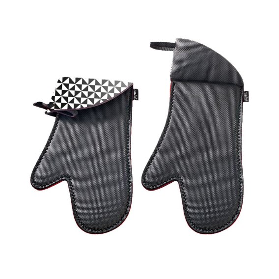 Rękawica ochronna PROTECTOR Oven z neoprenu o długości na 29cm do 38cm jest odporna na temperaturę do 220 C , antypoślizgowa oraz wodoodporna. Rękawica jest wyjątkowo elastyczna. Rękawica na zewnątrz jest w kolorze czarnym z wywijanym mankietem w biało czarny wzór. Wewnątrz jest czerwona, co widać na zewnętrznych szwach.
