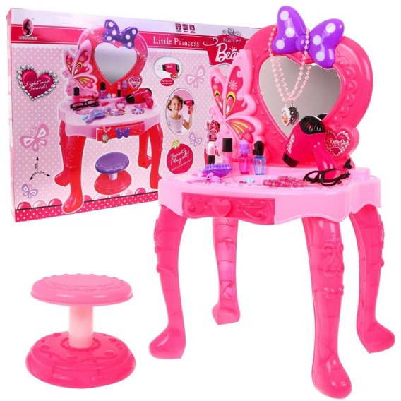 | Niesamowita, śliczna różowa toaletka dla każdej małej strojnisi. Bogato wyposażony zestaw, przypadnie do gustu każdej dziewczynce. Toaletka posiada otwieraną szufladę, w której można schować różne drobiazgi. Suszarka działa jak prawdziwa (odgłos i nawiew). Zabawka posiada efekty dźwiękowe i świetlne. Migające światełka na kokardzie u góry lustra, melodyjka. Zabawka przeznaczona dla dzieci od 3 - go roku życia, posiada certyfikat CE. Suszarka zasilana jest bateriami typu 1 x AA (brak w zestawie), lustro 2 x AA (brak w zestawie). |