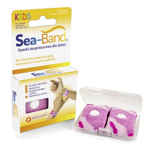 Sea - Band  opaski akupresurowe zapobiegające mdłościom Opaski akupresurowe Sea - Band stymulują znajdujący się na nadgarstkach punkt P6 (Neiguan / Nei - Kuan) i niwelują mdłości oraz nudności związane z: chorobą lokomocyjną, ciążą, migreną, chemioterapią. Znajdujący się na opaskach plastikowy guzik uciska punkt Neiguan. Jak stosować opaskę przeciw mdłościom Sea-Band ? Opaski zakłada się na oba nadgarstki. Należy zwrócić uwagę aby specjalny guzik był umiejscowiony zgodnie z załączoną instrukcją w punkcie P6 (Neiguan / Nei - Kuan). Opaski przeznaczone są dla dzieci powyżej 3 roku życia, dla kobiet w ciąży zmagającymi się z mdłościami, osób w trakcie chemioterapii czy osób z migreną. Sea-Band - Opaska jest wielokrotnego użytku, nadaje się do prania.