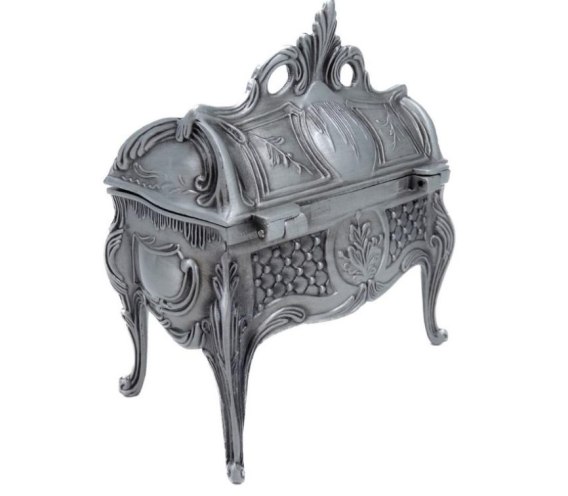 Szkatułka metalowa - 2056M to srebrna, bogato zdobiona szkatułka na nóżkach