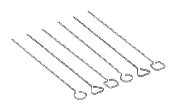 Zestaw 6 szpikulców do grillowania ze stali nierdzewnej wielokrotnego użytku ze spiczastymi końcówkami. Każdy szaszłyk do mięsa ma unikalny uchwyt do osobistej identyfikacji. W ten sposób możesz łatwo znaleźć własny szpikulec. Stylowe szaszłyki mają długość 30 cm.