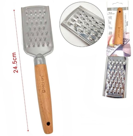 Każda kuchnia musi być wyposażona w takie urządzenie. Solidna konstrukcja i wygodny uchwyt sprawie, że tarcie stanie się bezpieczne. Tarka wykonana jest z wysokiej jakości stali nierdzewnej wraz z drewnianym uchwytem. Została wyposażona w oczko do zawieszenia.