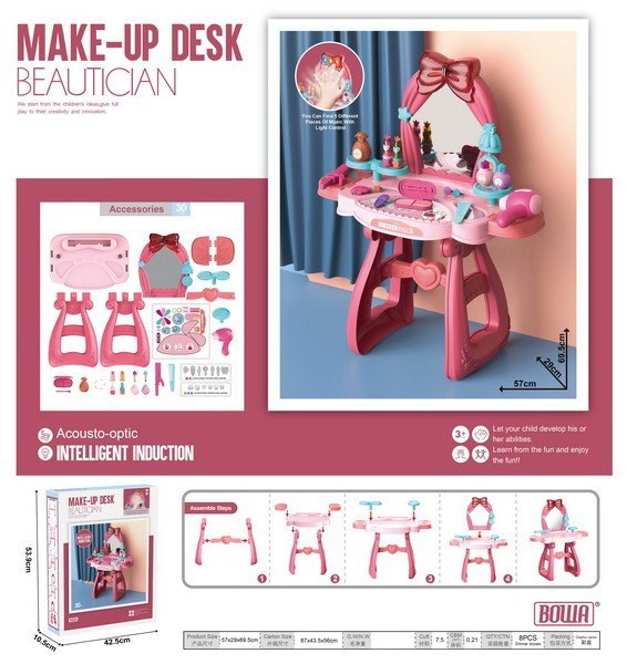 - toaletka ok. 70 cm x 56 cm x 27 cm, - suszarka ok. 10 cm x 6 cm, - prostownica ok. 16 cm x 4 cm x 2 cm, - kosmetyczka ok. 9 cm x 5 cm x 2 cm, - flakonik na perfumy ok. 7 cm x 4,5 cm, - lakier do paznokci ok. 6,5 cm x 3,5 cm, - szminka ok. 8 cm x 2 cm, - pierścionek o średnicy zewnętrznej ok. 1,5 cm, - spinka do włosów ok. 5 cm x 2,5 cm, - grzebień ok. 13 cm x 3 cm, - opakowanie ok. 54 cm x 42,5 cm x 10,8 cm. |