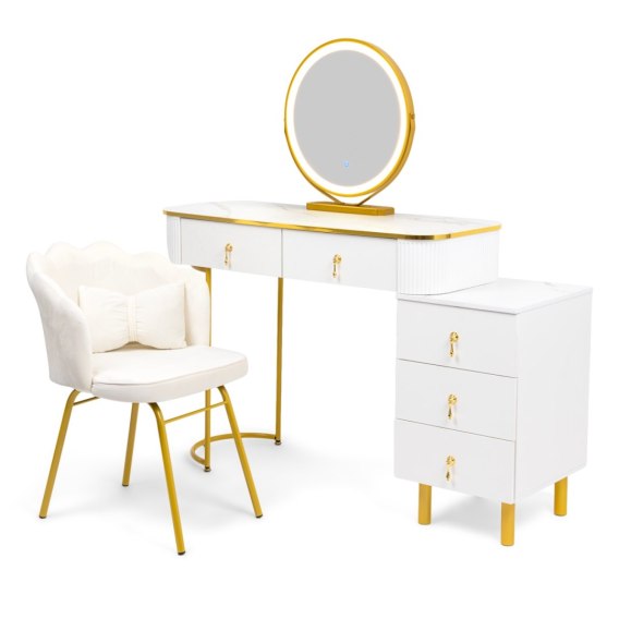 Toaletka VERDIRO zachwyca połączeniem bieli, złotych detali i blatu z eleganckim, drewnianym wykończeniem, dzięki czemu wygląda jak mebel z ekskluzywnego salonu. Delikatne linie i okrągłe lustro nadają jej lekkości, a jednocześnie sprawiają, że przyciąga wzrok od razu po wejściu do pomieszczenia. Doskonale wpasuje się zarówno w sypialnię w stylu glamour, jak i w jasne, nowoczesne wnętrza.