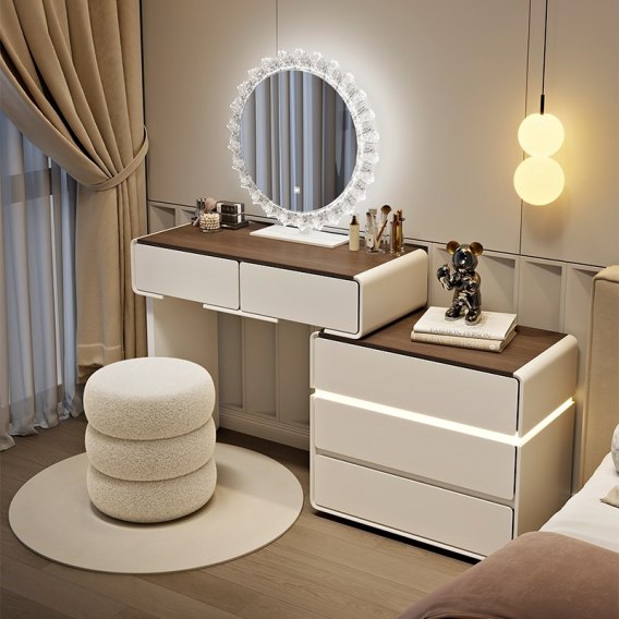 • Zestaw zawiera: toaletkę, komodę boczną, lustro z oświetleniem LED, taboret