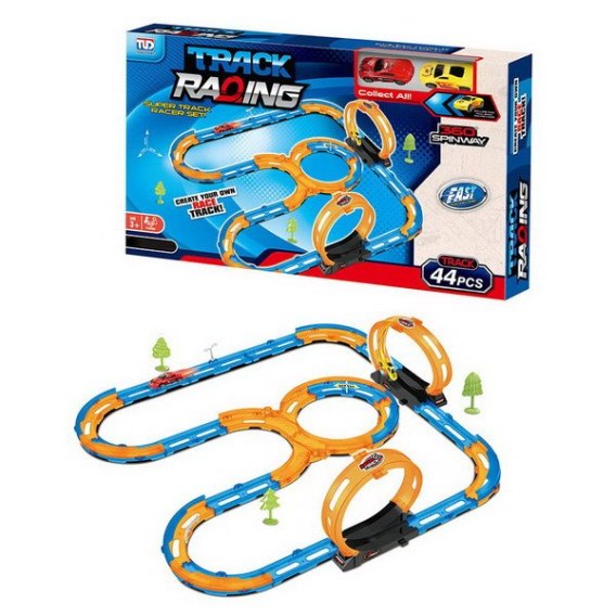 Tor wyścigowy z pętlami 360 stopni, dla dzieci od 3-go roku życia. Tor wykonano z najlepszej jakości plastiku w żywych kolorach. Na zestaw składa się 44 elementów do samodzielnego montażu. Tor posiada odcinki proste do rozpędzenia pojazdu, dwie pętlę 360 stopni i dwa pojazdy. Pojazdy napędzane są napędem pull back. Wystarczy delikatnie nacisnąć pojazd do tyłu, by przejechał tor z pełną mocą.