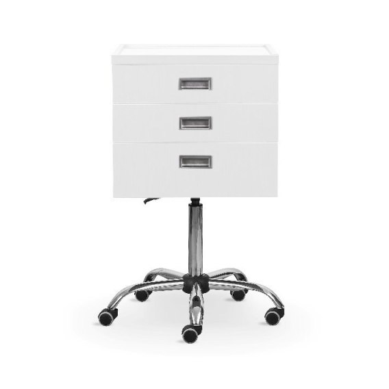 Asystor stomatologiczny AS-3 biały Mobilna szafka do gabinetu stomatologicznego wyposażona jest w 3 szuflady. Asystor stomatologiczny posiada chromowaną podstawę i szklane blaty. Szafka posiada możliwość regulacji wysokości. Mebel dedykowany jest przede wszystkim gabinetom dentystycznym. Szafka znajdzie swoje zastosowanie także w placówkach lekarskich innych specjalizacji. Produkt posiada system jezdny z możliwością zmiany wysokości. Szafka medyczna posiada trzy szuflady, ostatnia na dole jest trochę większa. Szuflady posiadają bezpieczne uchwyty niewystające poza bryłę mebla. WYMIARY: Model AS-4 Całkowita szerokość; 540mm Całkowita głębokość: 510mm Całkowita wysokość min: 840mm Całkowita wysokość max; 1050mm Średnica podstawy: 650mm Dopuszczalne obciążenie blatu: 10kg
