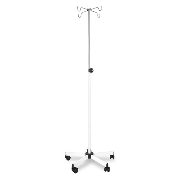 Stojak dla kroplówek (płynów do infuzji) Przemieszczanie statywu umożliwia pięcionóg z kółkami jezdnymi, natomiast regulacja wysokości wieszaka możłiwa jest dzięki zastosowaniu układu zaciskowego. Produkt został wykonany ze stali nierdzewnej. Stojak dla kroplówek pokryty jest farbą proszkową. Stojak dla kroplówek w wersji SK-4 wyposażony jest w cztery wieszaki do pojemników z płynami infuzyjnymi. Wysokość: min. 1100 - max. 2000 mmŚrednica podstawy: 680 mm