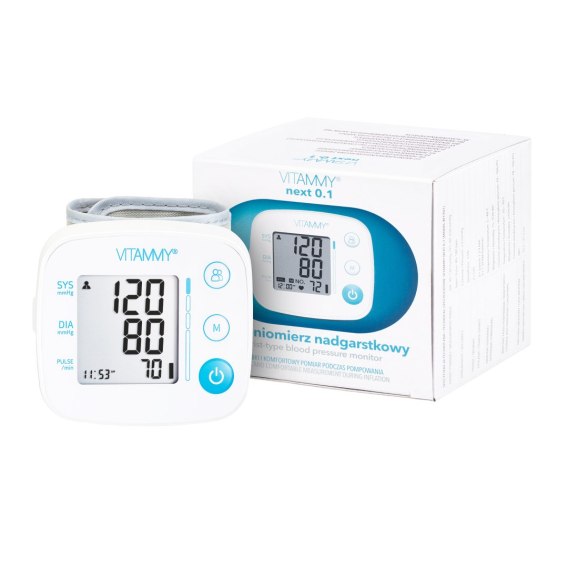 VITAMMY NEXT 0.1 - nowoczesny i dostępny, aby wybór był prosty NEXT 0.1 to ciśnieniomierz nadgarstkowy nowej generacji, który oferuje funkcje i właściwości wyprzedzające standardy, zachowując przyjazną cenę - aby wybór ciśnieniomierza pozostawał prosty. Ten nowy model w gamie NEXT wyposażony został w najnowsze technologie skracające czas pomiaru i niwelujące błędy, takie jak Pomiar Podczas Pompowania oraz Wykrywanie Poruszenia podczas pomiaru. NEXT 0.1 wykrywa arytmię, oferuje 2 użytkownikom pamięć 120 pomiarów (2x120), a także dysponuje mankietem o podwyższonym standardzie i o wyjątkowo dużym zakresie obwodu nadgarstka: 12,5 - 21,5 cm, aby każda Twoja potrzeba była zaspokojona. NEXT 0.1 - regularnie dbanie o siebie stanie się łatwiejsze Pomiar Podczas Pompowania - technologia następnej generacji dostępna jest teraz w ciśnieniomierzu nadgarstkowym. Dzięki nowoczesnej technologii komfortowego pomiaru w trakcie napełniania mankietu Twoja motywacja do wykonywania regularnych pomiarów może wzrosnąć. Mierzenie ciśnienia jest szybsze, cichsze i bardziej delikatne a regularnie dbanie o siebie łatwiejsze. Technologia komfortowego Pomiaru Podczas Pompowania - jak to działa? W ciśnieniomierzach poprzedniej generacji aktywna faza pomiaru rozpoczynała się dopiero po napełnieniu mankietu do określonej wartości i przebiegała podczas stopniowego i powolnego jego opróżniania. Wiązało się to z dłuższym czasem oczekiwania na wynik ze ściśniętym ramieniem. Ciśnieniomierze nowej generacji, dzięki technologii Pomiaru Podczas Pompowania, rozpoczynają pomiar tuż po rozpoczęciu napełniania mankietu i kontynuują analizę wraz z delikatnym zwiększaniem ciśnienia tylko do momentu osiągnięcia górnej wartości ciśnienia skurczowego. Taki pomiar przebiega szybciej i wiąże się to z odczuwaniem większego komfortu przez użytkownika. Zobacz, jak wykorzystać wszystkie zalety nowoczesnego ciśnieniomierza nadgarstkowego NEXT 0.1 Dzięki kieszonkowym rozmiarom, szybkiemu i cichemu pomiarowi podczas pompowania nie musisz czekać na idealny moment, aby zmierzyć ciśnienie - z NEXT 0.1 wcale nie potrzebujesz na to dużo czasu i miejsca. Ciśnieniomierz NEXT 0.1 możesz wszędzie zabrać ze sobą, co daje Ci możliwość pomiaru w różnych codziennych lub niecodziennych sytuacjach, np. w samochodzie, pociągu, przy biurku, na sofie przed telewizorem. Możesz znaleźć czas na kontrolę ciśnienia w okolicznościach, w których nie było to możliwe łatwe ciśnieniomierzem naramiennym. Posiada wszystkie niezbędne funkcje VITAMMY NEXT 0.1 posiada funkcje diagnostyczne, które zwiększają wiarygodność pomiaru i spektrum zastosowań, a także eliminują częste błędy: Wykrywanie nieregularnego rytmu serca (m.in. arytmii) Uśrednianie ostatnich 3 wyników pomiarów - niweluje wpływ chwilowych anomalii, w tym efektu "białego fartucha" Interpretacja wyniku pomiaru według wytycznych WHO - wiesz, kiedy należy o siebie zadbać Wykrywanie poruszenia podczas pomiaru - pomaga wyeliminować wpływ jednego z najczęstszych błędów popełnianych podczas pomiaru Wysoki standard mankietu - możesz to poczuć Mankiet o podwyższonym standardzie wykonany ze specjalnej dzianiny i z materiałów najwyższej jakości: zapewnia poczucie większego komfortu, jest trwały i dłużej zachowuje swoje właściwości. Nowy rodzaj zapięcia (rzep) zwiększa wygodę użytkowania dzięki łatwiejszemu zapinaniu i rozpinaniu przy obniżonym poziomie hałasu. 12,5 - 21,5 cm to wyjątkowo uniwersalny zakres regulacji mankietu nadgarstkowego zaspakający potrzeby większości użytkowników. Certyfikowana wiarygodność Next 0.1 to certyfikowany wyrób medyczny posiadające Certyfikat CE (Certyfikat Zgodności) wydany przez autoryzowaną jednostkę notyfikowaną EU: TÜV SÜD PRODUCT SERVICE GMBH RIDLERSTR 65, D-80339 MÜNCHEN, NIEMCY. Zaznaj spokoju, używając ciśnieniomierza zgodne z szeregiem wymagań dotyczących wiarygodności pomiaru (badania kliniczne), odporności za zakłócenia elektromagnetyczne, bezpieczeństwa użytkowania, prawidłowego oznakowania produktu, itp. Duży ekran w kompaktowej obudowie VITAMMY NEXT 0.1 wyposażony został w duży, czytelny ekran, którego nie powstydziłby się niejeden ciśnieniomierz naramienny - mimo tego jego obudowa pozostaje kompaktowa i lekka. Ekologiczne i ekonomiczne VITAMMY NEXT 0.1 Dzięki zasilaniu tylko 2 bateriami AAA oszczędzasz i postępujesz ekologicznie, zyskując zdrowie. Sporo miejsca na wspólne dbanie o zdrowie 2 tory pamięci po 120 wyników. Polska marka VITAMMY - otrzymujesz znacznie więcej niż produkt VITAMMY to polska marka. Dbamy o to, aby nasze produkty spełniały potrzeby lokalnych odbiorców i pomagały rozwiązywać aktualne problemy. Zapewniamy polskie opisy, instrukcję w języku polskim oraz kontakt z Infolinią Pomocy i Wsparcia Technicznego w języku polskim. Pozostajemy w kontakcie: Wsparcie i Pomoc Infolinii 887 11 00 66 Masz pytania dotyczące wyboru produktu, jego użytkowania, masz wątpliwości, potrzebujesz wsparcia - skontaktuj się z profesjonalną Infolinią Pomocy i Wsparcia Techniczego VITAMMY. Gwarancja jako obietnica jakości VITAMMY Ciśnieniomierz VITAMMY NEXT 0.1 objęty jest 2-letnią gwarancją w ramach OBIETNICY JAKOŚCI VITAMMY, która obejmuje zapewnienie jakości technicznej urządzenia, wartości pomiarowej i użytkowej urządzenia, jak i wsparcia użytkownika w zakresie obsługi i rozwiązywania problemów, a także dostępności akcesoriów. Seria ciśnieniomierzy VITAMMY NEXT Wybierz swój nowy, doskonale dopasowany ciśnieniomierz z najbardziej kompletnej serii VITAMMY NEXT i zacznij dbać o prawidłowe ciśnienie krwi już teraz. VITAMMY NEXT 0.1 to naramienny ciśnieniomierz elektroniczny, który warto mieć zawsze przy sobie. Vitammy Next 0.1 ma szereg przydatnych funkcji ułatwiających dokładny pomiar ciśnienia w każdej sytuacji bez konieczności wi