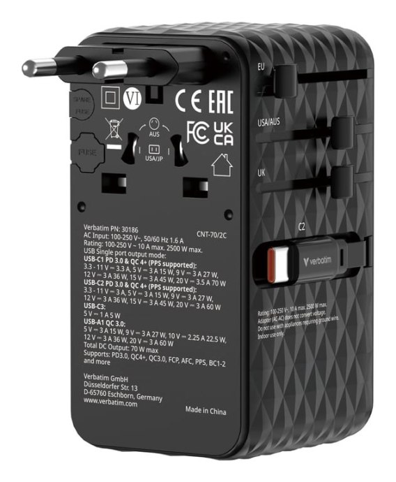 Verbatim 30186. Typ ładowarki: Wewnętrzna, Rodzaj zasilania: Prąd przemienny, Kompatybilność ładowarki: Uniwersalne. Napięcie: 100 - 250 V, Napięcie wyjściowe (max): 250 V, Prąd wyjściowy adaptera AC: 10 A. Liczba portów USB 2.0: 1, Ilość portów USB typu C: 1, Szybkie ładowanie. Kolor produktu: Czarny