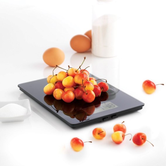 Elektroniczna waga kuchenna z wyświetlaczem i powierzchnią wykonaną z temperowanego szkła. Elegancka czerń idealnie dopasuje się do nowoczesnej kuchni.
