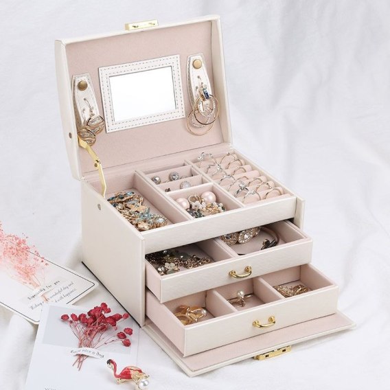 Wśród osobistych przedmiotów każdej kobiety ważną rolę odgrywa biżuteria. Wielopoziomowa szkatułka na biżuterię jest to niezastąpiony oraz niezawodny produkt w przechowywaniu swoich drogocenności. Oddzielne przegródki i szuflady zapewniają doskonałe warunki przechowywania kolczyków, bransoletek, zegarków, łańcuszków, okularów oraz innych kosztowności. Szkatułka na biżuterię sprawi, że problem splatania się ze sobą łańcuszków, przetarć oraz zarysowań zostanie wyeliminowany. Miękka wyściółka chroni drogocenną biżuterię przed porysowaniem. Szkatułka na biżuterię posiada duże, zdejmowane lusterko, które można wykorzystać podczas przymierzania biżuterii, a także robienia makijażu.