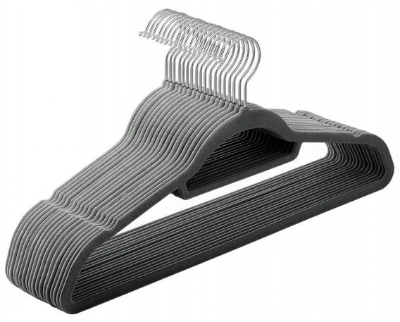 Komplet wieszaków aksamitnych. Flokowana powierzchnia czyni je bardzo praktycznymi, zapobiega bowiem zsuwaniu się ubrań. Wieszaki Maxi są odpowiednio profilowane, co pomaga uniknąć zagnieceń na odzieży.