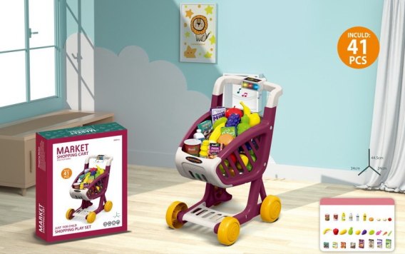 - koszyk na zakupy ok. 44,5 cm x 24 cm x 34 cm, - butelka z mlekiem ok. 8 cm x 3,5 cm, - butelka z ketchupem ok. 9 cm x 3,5 cm, - puszka z popcornem i mlekiem truskawkowym ok. 6 cm x 4,5 cm, - butelka z sokiem owocowym ok. 8 cm x 3 cm, - butelka z lemoniadą ok. 9 cm x 4 cm, - warzywa: marchewka ok. 7 cm długości, pomidor, ok. 5,5 cm x 4 cm, seler naciowy ok. 9 cm długości, kukurydza ok. 8,5 cm długości, - owoce: jabłko ok. 8,5 cm x 7 cm, banan ok. 15 cm x 9 cm, ananas ok. 8 cm x 4 cm, cytryna ok. 9 cm x 6 cm, winogrono ok. 8,5 cm x 4,5 cm, babaco ok. 9 cm x 4,5 cm, - ryba ok. 9,5 cm x 6 cm, - jajko ok. 5 cm x 3,5 cm, - średnica kółeczka w wózku ok. 8 cm, - opakowanie ok. 49 cm x 38 cm x 10,5 cm. |