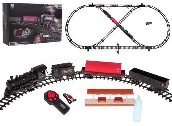 - lokomotywa, - wagon z węglem, - wagon z kontenerem, - wagon dla zwierząt, - części składowe toru, - pilot 2,4 GHz, - akumulator 3,7V, - pipetka na wodę, - kabel do ładowania USB, - instrukcja obsługi, - stacja, - elementy dekoracyjne kartonowe: góry, miasto, most, drzewko, sygnalizacja świetlna, znaki drogowe, 5 postaci |