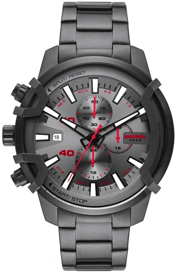Srebrzystoszary odcień z delikatnym, szczotkowanym wykończeniem tworzy bazę, która wydobywa moc detali. Wyraziste, czerwone akcenty na wskazówkach i subtarczach wnoszą dynamikę i energię, jakby zegarek był gotowy na każdą akcję. Wysokie indeksy i elementy wystające z powierzchni tarczy nadają jej trójwymiarowego charakteru, podkreślając solidność i głębię projektu. Dzięki powłoce luminescencyjnej na wskazówkach i indeksach odczyt czasu jest możliwy nawet w słabym świetle, co zwiększa praktyczność modelu. Maszynowy napis DIESEL wygrawerowany z boku koperty to detal, który mówi wiele o charakterze tego modelu - surowy, bezkompromisowy, gotowy sprostać oczekiwaniom najbardziej wymagających mężczyzn.