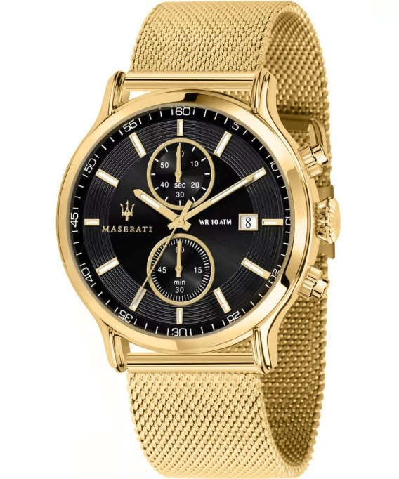 Bransoleta typu mesh, wykonana z odpornej na upływ czasu stali nierdzewnej, to prawdziwa esencja nowoczesnego stylu. Jej subtelny, a jednocześnie wyrazisty design doskonale przylega do nadgarstka, zapewniając komfort i pewność w każdej sytuacji. Chronografy i datownik nie tylko wzbogacają funkcjonalność zegarka Maserati, ale także znacząco zwiększają jego prestiż. Chronograf to jeden z najbardziej pożądanych elementów w zegarkach premium, a jego obecność świadczy o skomplikowanej mechanice i precyzji wykonania. Stylowy wygląd przycisków chronografu sprawia, że zegarek zyskuje na atrakcyjności, a jego wartość wzrasta. Klasę zegarka podkreśla dodatkowo elegancki sposób wyświetlania daty.