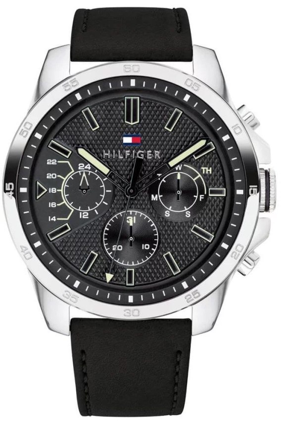 Zegarek Męski Tommy Hilfiger Decker 1791563 wyposażony jest w działające chronografy: czasu dobowego 12/24h- wyświetlanie godziny z uwzględnieniem całej doby umożliwia rozróżnienie godzin przed i popołudniowych oraz datownikiem dni miesiąca i tygodnia