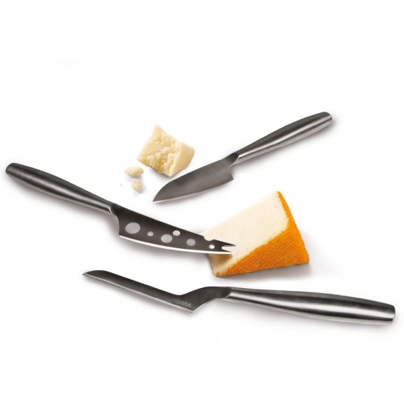 W skład zestawu wchodzi: nóż do serów twardych, o krótkiej, ostrej klindze, nóż do serów miękkich cheesy o rozwidlonym czubku i klindze przypominającej ser z dziarami i trzeci nóż do serów pleśniowych o wąskim ostrzu.