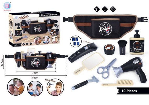 Bogato wyposażony zestaw barbera z pasem dla dzieci od 3-go roku życia. Zestaw składa się z 10 elementów, wykonany został z najlepszej jakości materiałów, co gwarantuje mu długie użytkowanie. W skład zestawu wchodzą: pas, maszynka do golenia, suszarka, golarka elektryczna, nożyczki, grzebień, lusterko, pędzel, butelka z pompką na kosmetyk, pudełko na piankę. Z tak bogato wyposażonym zestawem, Twoja pociecha będzie mogła bawić się w strzyżenie, modelowanie zarostu, czy też fryzur. Pas można przewiesić przez biodra i umieścić w nim wszystkie elementy zestawu. Suszarka posiada podświetlenie i odgłosy suszenia. Zasilana jest bateriami typu 2 x AAA 1,5 V (brak w zestawie). Funkcje zestawu: - odpowiedni dla dzieci od 3-go roku życia, - wykonany z najlepszej jakości materiałów, - bogate wyposażenie sprawia, że dziecko będzie mogło poczuć się jak prawdziwy barber, - pas barbera, zapinany na zatrzask, można przewiesić przez biodra i ułożyć w nim wszystkie niezbędne elementy, - suszarka posiada oświetlenie i odgłosy suszenia. |