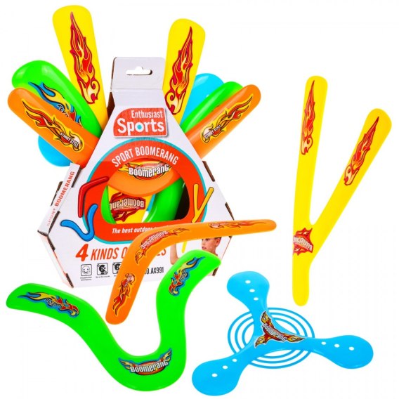 | - bumerang pomarańczowy ok. 29 cm x 18 cm x 0,5 cm, - bumerang niebieski ok. 22 cm x 22 cm x 0,5 cm, - bumerang zielony ok. 23 cm x 28 cm x 0,5 cm, - bumerang żółty ok. 29 cm x 17 cm x 0,5 cm, - opakowanie z bumerangami ok. 28,5 cm x 31 cm x 3,5 cm |
