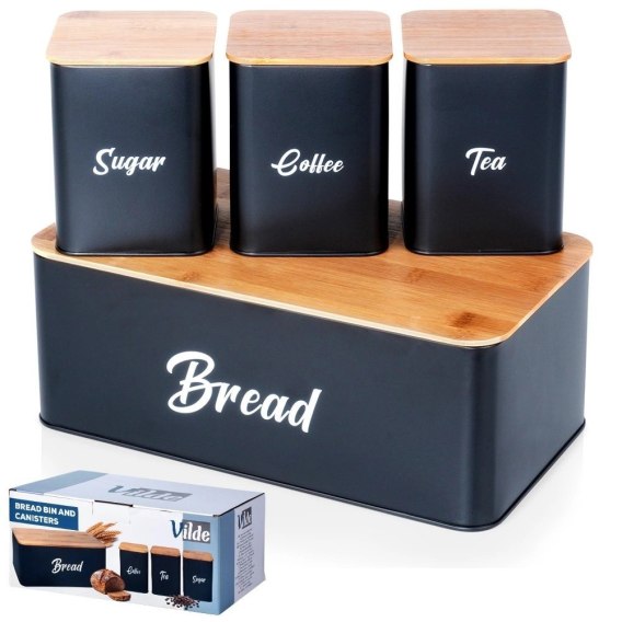 Zestaw składający się z pojemnego chlebaka oraz trzech pojemników kuchennych w nowoczesnym wzornictwie. Chlebak posiada praktyczne zamknięcie w formie deski wykonanej z drewna, dzięki czemu możemy wykorzystać ją do krojenia pieczywa. Niezwykle efektownie prezentuje się w kuchni. Prosty, klasyczny wzór sprawi, że zestaw pasuje do każdej kuchni.