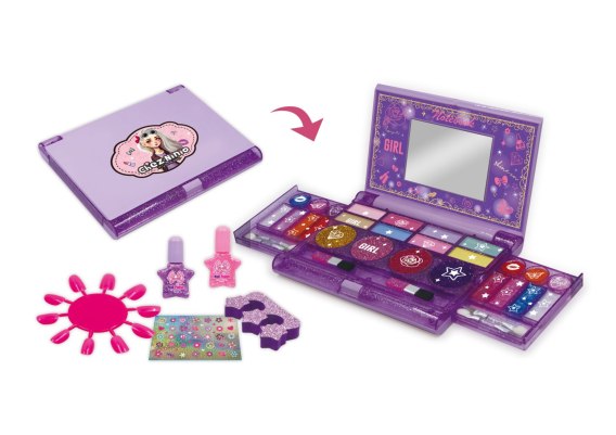 Zestaw do makijażu dla dzieci z rozkładanym tabletem i lusterkiem, powyżej 3-go roku życia. Zestaw zawiera wszystko, co niezbędne do malowania twarzy oraz paznokci. Wszystkie kosmetyki mieszczą się na palecie w zgrabnym, rozkładanym tablecie, wygodnym do przenoszenia. Paleta zawiera wiele różnokolorowych cieni i szminek oraz pędzelki do makijażu. Zestaw wykonany jest z bezpiecznych materiałów. Funkcje zestawu: - przeznaczony dla dzieci od 3-go roku życia, - wykonany z bezpiecznych dla dziecka materiałów, - kosmetyki są łatwe w zmyciu, - zestaw jest bogato wyposażony, zawiera cienie, błyszczyki, szminki, pędzelki, lakiery, - wygodne, rozkładane pudełko-tablet z lusterkiem na kosmetyki. |