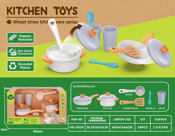 Zestaw garnków wykonanych z Bioplastiku, dla dziecka od trzeciego roku życia. Zestaw składa się z 10 elementów. Mamy patelnię z pokrywką, garnek z pokrywką, chochelkę, łopatkę, dwie łyżeczki oraz dwa kubki. Ten zestaw daje nieograniczone możliwości zabawy. Materiał, z którego wykonany jest zestaw, jest przyjazny dla dziecka i środowiska naturalnego. Można go wyparzać w 120 stopniach i nadaje się do recyclingu.