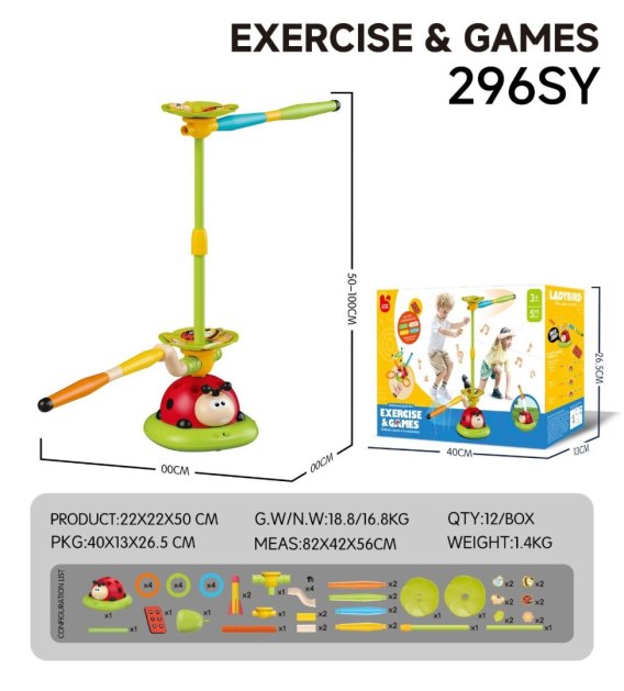 Funkcje zestawu: - odpowiedni dla dzieci od trzeciego roku życia, - wykonany z najlepszej jakości materiałów, - żywa kolorystyka wykonania, - zestaw oferuje 5 gier do wyboru: automatycznie obracającą się skakankę, wystrzeliwaną w powietrze rakietę, grę w rzucanie do celu, grę z omijaniem przeszkód, grę z omijaniem przeszkód i zbieraniem zwierzątek. - możliwość sterowania poziomu trudności pilotem dołączonym do zestawu, - możliwość zabawy przy muzyce, - świetny zestaw na aktywne spędzenie czasu na świeżym powietrzu. |