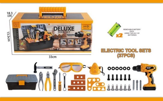 Bogato wyposażony zestaw narzędzi z interaktywną wiertarko-wkrętarką oraz skrzynką narzędziową dla dzieci powyżej 3-go roku życia. Zestaw wykonany został z najlepszej jakości plastiku i posiada aż 37 elementów. Prócz dużej skrzynki na narzędzia, wyglądającej profesjonalnie w zestawie mamy też: interaktywną wiertarko-wkrętarkę z wymiennymi bitami, okulary ochronne, maseczkę, śrubokręt, młotek, klucz francuski, kombinerki, obcęgi, oraz wiele śrubek, nakładek, drewienek do wkręcania. Wiertarko-wkrętarka zasilana jest bateriami typu 2 x AA 1,5 V (brak w zestawie). Wkręca i wykręca, posiada wymienne bity, oraz wyjmowany akumulator.