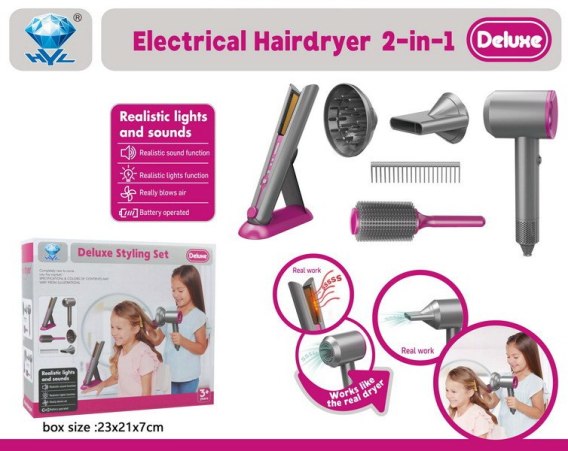 Bogato wyposażony, interaktywny zestaw małej fryzjerki dla dzieci od 3-go roku życia. Zestaw wykonano z dbałością o szczegóły. Znajduje się tutaj suszarka z wymiennymi dyszami, dyfuzorem i nasadką skupiającą, prostownica do włosów, grzebień, szczotka do włosów oraz stojak na prostownicę. Suszarka zasilana jest bateriami typu 2 x AA 1,5 V (brak w zestawie), prostownica bateriami typu 2 x AA 1,5V (brak w zestawie). Suszarka wydaje odgłosy charakterystyczne dla suszenia i posiada delikatny nawiew. Prostownica do włosów, po włączeniu świeci światełkami i wydaje odgłosy charakterystyczne do prostowania włosów.