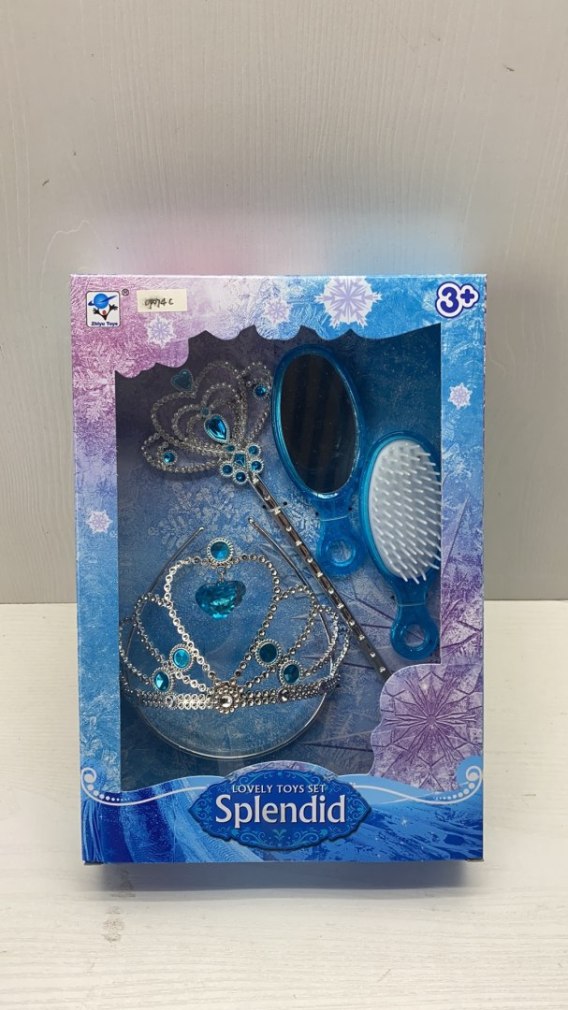 Znakomity, przepięknie wykonany zestaw małej księżniczki to propozycja dla dzieci od 3-go roku życia. Zestaw składa się z tiary, różdżki, lusterka i szczotki do włosów. Tiarę i różdżkę ozdobiono mieniącymi się błękitnymi kamieniami, co dodaje im niesamowitego uroku.