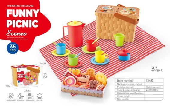 Koszyk piknikowy z akcesoriami dla dzieci od 3 - go roku życia. Idealny sposób na zabawę na świeżym powietrzu. Ten bogato wyposażony zestaw składa się z 35 elementów: pojemnego koszyka, dzbanka, filiżanek, talerzyków, łyżeczek oraz różnych smakołyków. W zestawie znajduje się również koc piknikowy. Funkcje zestawu: - przeznaczony dla dzieci od 3-go roku życia, - znakomicie wykonany z dbałością o detale, - przyciąga wzrok dziecka żywymi kolorami, - bogate wyposażenie, - idealny sposób na spędzenie czasu na świeżym powietrzu. |