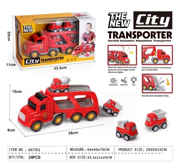 - autko z lawetą ok. 28 cm x 9 cm x 12 cm, - autka budowlane ok. 6 cm x 5 cm x 4 cm, - opakowanie ok. 34 cm x 11 cm x 20 cm. |
