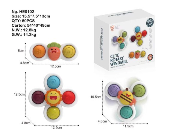 Zestaw spinnerów z przyssawkami, dla najmłodszych od 18-go miesiąca życia. Zestaw składa się ze spinnera ze słoneczkiem, pszczółką i marchewką. Na tylnej części zabawki znajduje się mocna przyssawka sprawiająca, iż zabawkę można przyczepić do różnych podłoży, np. na szybie, wannie czy stoliku. Zabawka jest wodoodporna, można ją używać podczas kąpieli, wytrzymałe łożyska zapewniają długotrwały i płynny obrót. Dzięki gumowym elementom do przyciskania maluch stymuluje zmysły, a jednocześnie się odpręża. Zabawki wykonane, ze świetnej jakości materiałów, w żywych kolorach.